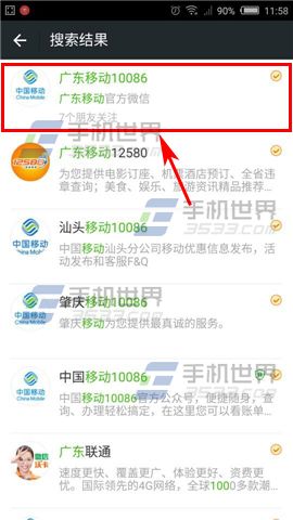 2)输入“广东移动10086”,当然你是别的省的移动用户同样以“xx移动10086”的方式来搜索,选择第一个【官方微信】,进行【关注】。(如下图)
