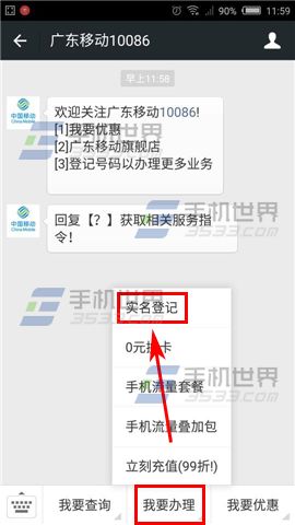 3)关注后会跳转到聊天窗口,点击【我要办理】按钮,再选择【实名登记】,一般的小伙伴都不记得服务密码了吧,可以选择“动态密码登录”,输入手机号码获取短信动态密码,输入密码后点击【登录】。(如下图)