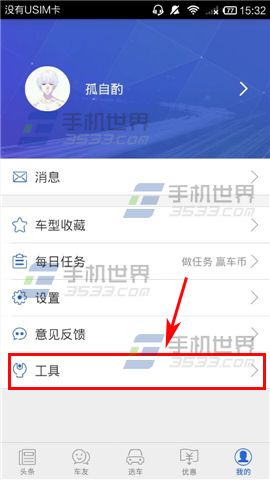 1)打开易车,进入首页点击右下角【我的】按钮,跳转后点击【工具】一项。(如下图)