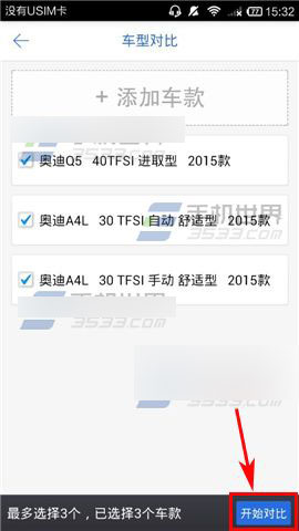 3)选择想要对比的车款,最多可以选择三款进行对比哦。(如下图)