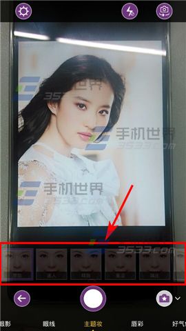 2)进入到拍摄模式,从主题妆中选择一款自己喜欢的妆容,点击使用,按下【快门】拍下照片。(如下图)
