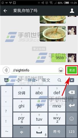 2)输入“//sightinfo”,点击【发送】(PS:发送出去后是看不到代码的,看得到说明没有设置成功),这时你发一个小视频,就能在左上角看到参数啦,需要取消同样发送一次这个代码,退出微信重登即可。(如下图)