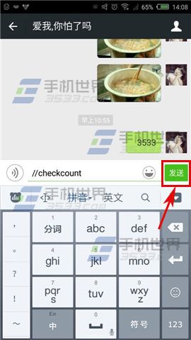 2)在框框中输入“//checkcount”的代码,点击【发送】(发送出去后没看到代码说明设置成功,若能看到说明没设置成功),就能看到当前的聊天窗口消息数量啦。(如下图)