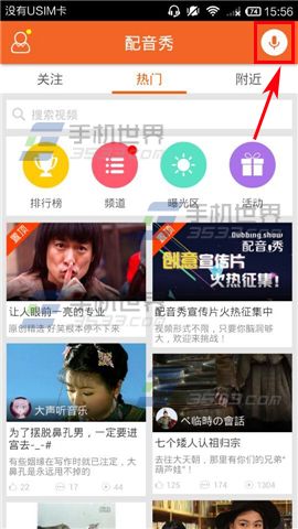 1)打开【配音秀】,进入首页后点击右上角的【话筒】图标,进入到素材页面。(如下图)