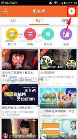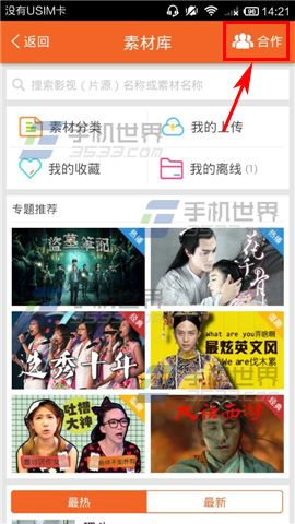 1)打开配音秀,进入首页点击右上角【话筒】图标,进入素材中心后,再点击右上角【合作】按钮。(如下图)