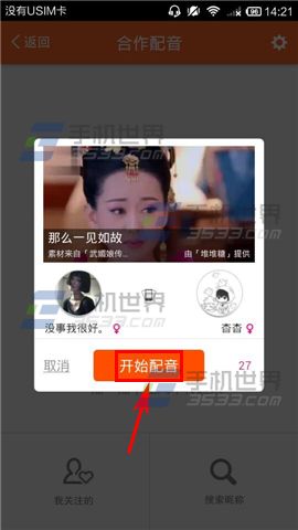 2)跳转到合作培养页面,摇晃手机寻找与你同时摇晃手机的人,如果你觉得系统给你们的配音素材还不错,可以点击【开始配音】哦,不过如果对方点了取消的话你们的合作就不能成功啦。(如下图)