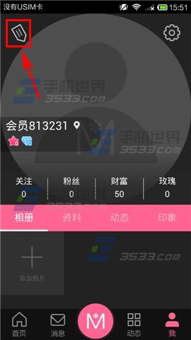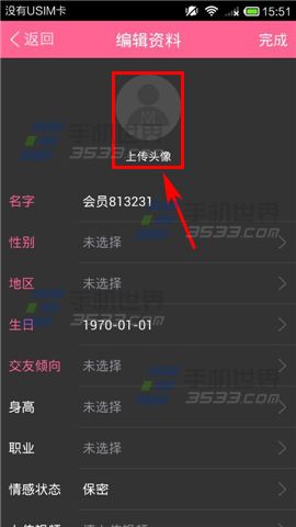 2)接着点击左上角的【铅笔】图标,进入到资料编辑页面,点击【上传头像】。(如下图)