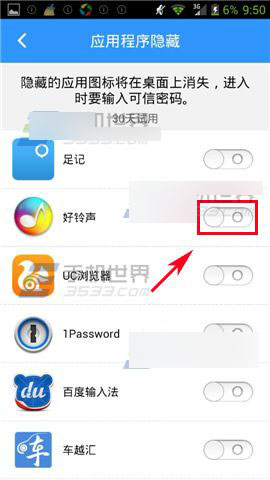 2)接着点击下方【应用程序加锁、隐藏】。进入程序隐藏页,点击需要隐藏的程序右边的【开关】。(如下图)