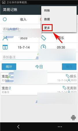 1)打开简易记账进入主页后点击右上角【...】,打开小分栏后接着点击【更多】。(如下图)