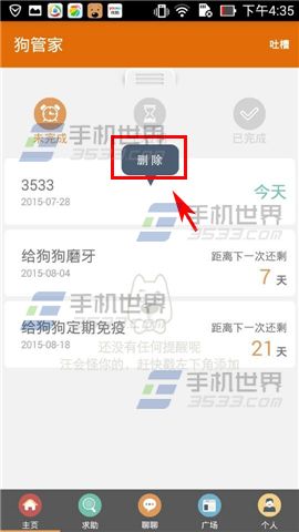 1)打开狗管家进入应用【主页】后点击下方【三】,接着找到你要取消的提醒,【长按】该提醒后点击【删除】即可。(如下图)
