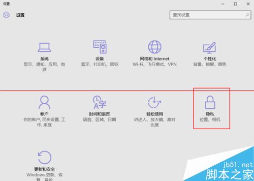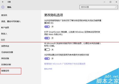 2、在打开的“隐私”设置选项栏中,拖动滚动条,找到最后的“背景应用”,如图所示。