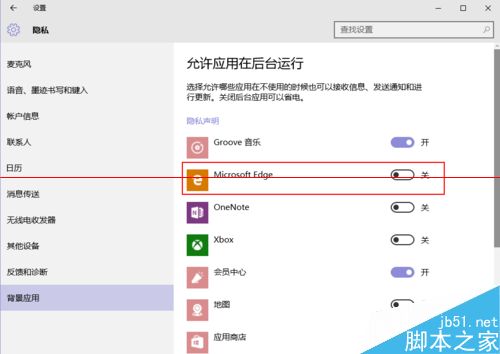 3、打开“背景应用”设置。在右边栏找到“Microsoft Edge”,将开关设置为“关”。如图所示。
