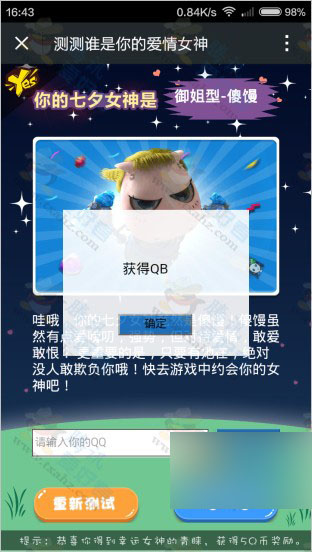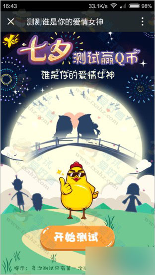 活动是微信的“Yes腾讯游戏平台” 女神携3000份Q币福利陪你浪漫过七夕的活动。活动有5个选择题的测试,亲测用我们的答案是100%中5Q币的,获得的Q币将在15个工作日到账。截至发稿前反正是100%的,不知道后续是否这样,脚本之家的朋友们速度撸吧。