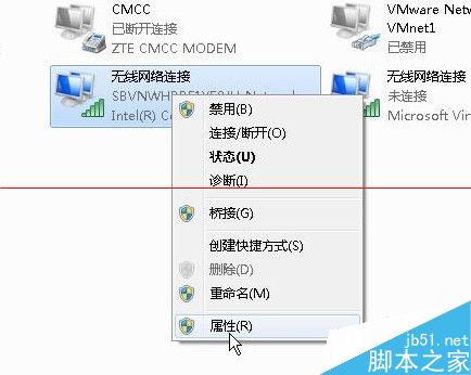 3、在打开的窗口里,选中正在使用的无线网卡图标,点击右键,选择“属性”。