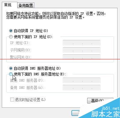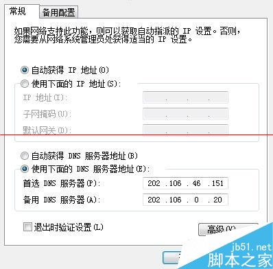 5、这时候,你看到系统默认是“自动获得IP地址”、“自动获得DNS服务器地址”,现在采用ADSL之类的拨号宽带上网的用户,一般都是这么采用默认设置的,这样每次上网时,路由器都会自动分配给用户一个IP地址,DNS服务器也就默认使用宽带提供商的,我估计现在用的应该是观滔宽带的DNS服务器。