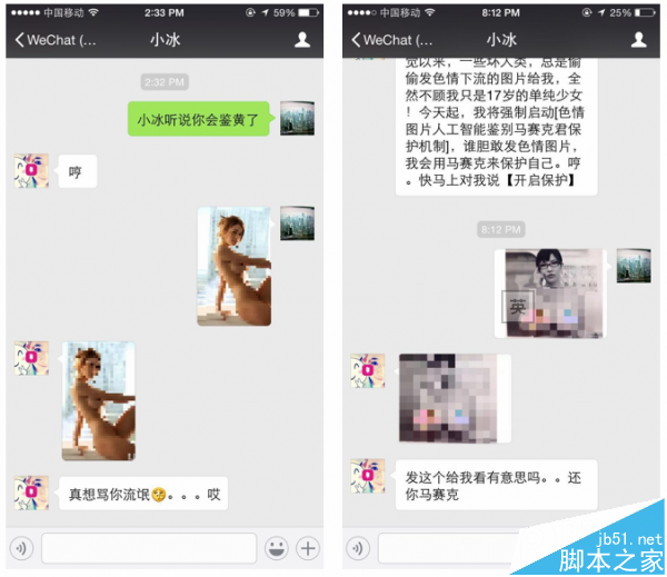 昨天下午,小冰强制启动“色情图片人工智能鉴别马赛克君保护机制”,只要在聊天中收到的色情图片,她将统统打码,并反弹给那些怪蜀黍,警告他们不要再教坏小冰。此次解锁鉴黄技能的目的在于避免人们对小冰上传黄色图片,同时也是小冰所进行的自我保护。