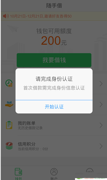 2、完成“身份验证”资料提交,获得信用积分和借款额度