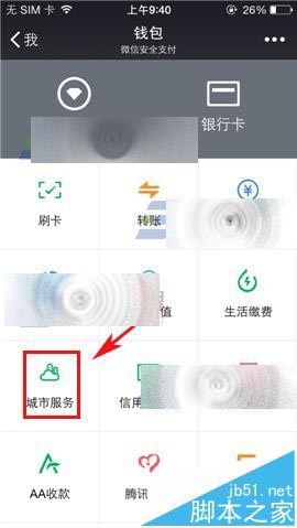 1)打开微信进入应用后点击右下角【我】,接着点击【钱包】进入钱包页面后点击【城市服务】。(如下图)