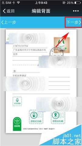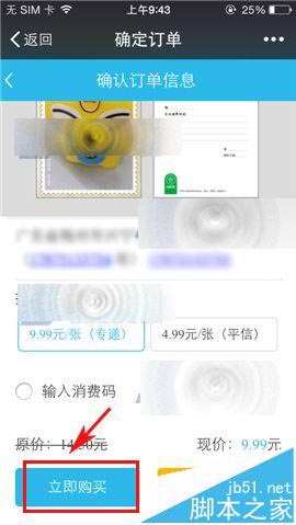 3)然后编辑明细片收货信息等后点击有上角【下一步】。接着选择邮寄方式,点击下方【立即购买】输入密码付款即可定制成功并且邮寄该明信片。(如下图)