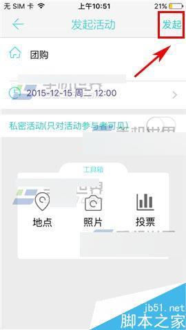 2)选择或输入活动类型,接着编辑活动内容后点击右上角【发起】。(如下图)