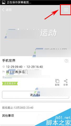 2)点击打开要解散的活动,点击右上角的【三横】;(如下图)