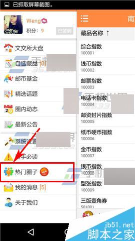 1)打开邮币圈,点击左上角的【三横】,然后点击下方的【热门圈子】;(如下图)