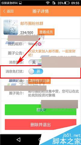 2)点击打开要设置圈子的头像,然后点击下方的【消息免打扰】旁边的【按钮】即可。(如下图)