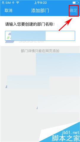 2)点击【+添加部门】,接着编辑部门名称后点击右上角【确定】即可。(如下图)