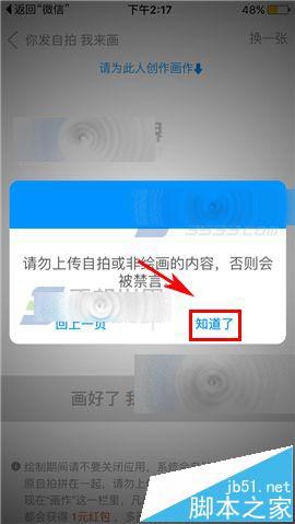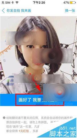 2)在提示下点击【知道了】,跳出别人的自拍,可以点击右上角【换一张】,选中后停在此页。画画可以自己使用手机画板或纸质拍照等任意方式,画好后等待100多秒后点击下方【画好了 我要上传作品】(如下图)