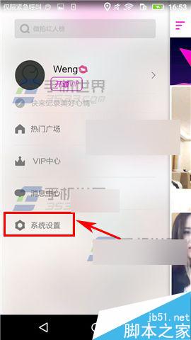 1)打开微拍,点击左上角的【三横】,然后点击【系统设置】;(如下图)