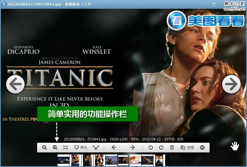美图看看为用户准备了一个很实用的功能按钮栏,在其中可以实现图片缩放、图片网络分享、图片切换、角度旋转等操作;当鼠标移动到看图窗口下部区域时,还有悬浮的浏览切换按钮出现,如图02所示。而且,软件还会一并将当前浏览图片的详细信息显示出来,比如分辨率、文件大小等等,非常人性化。
