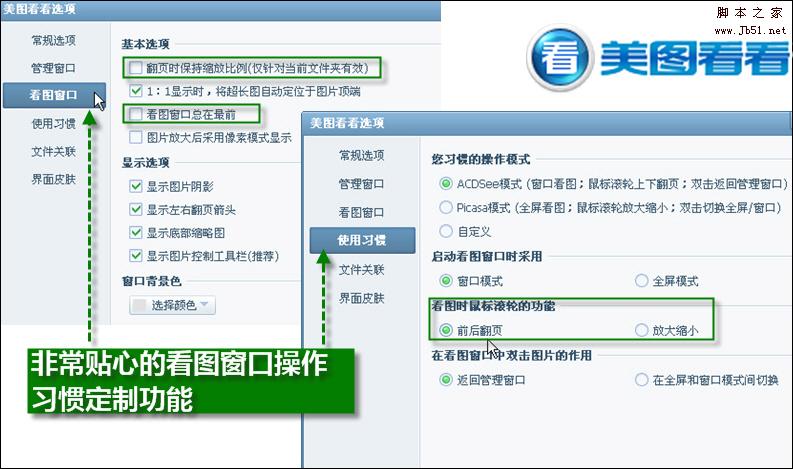 美图看看在满足用户需要的同时,还提供了对看图操作习惯的自定义功能。比如,我们可以定义让看图窗口总在最前,这样其他操作都不会打扰到我们流畅看图;也可以将看图时鼠标滚轮的功能设置为前后翻页,这可能更适合一些之前使用ACDSee的用户,如图04所示。为用户提供操作自定义,这让美图看看这款小巧的看图软件充满了个性,同时也更符合我们的使用实际。