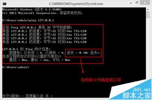 2、输入“ ping 127.0.0.1” 检查电脑网卡是否正常
