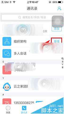 1)打开云之家,点击下方的【通讯录】,接着点击下方的【管理】;(如下图)