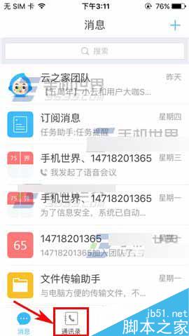 1)打开云之家,点击下方的【通讯录】,接着点击打开要发送无痕消息的好友;(如下图)