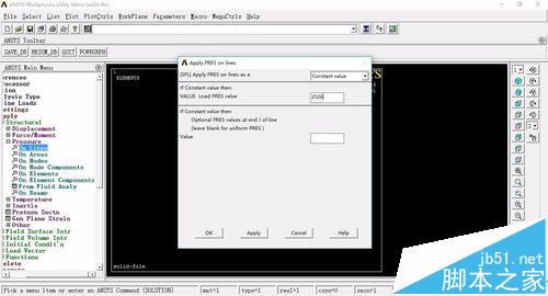 3、施加载荷,在模型的左端施加固定边界条件,main menu --solution--define loads--apply--structural--displacement--on lines在模型的上端施加端部均部压力,main menu --solution--define loads apply--structural--pressure--on lines,压力值为2625.