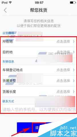 2)点击右上角的【帮您找货】,接着点击编辑框输入车辆信息以及联系电话,最后点击【提交】即可。(如下图)