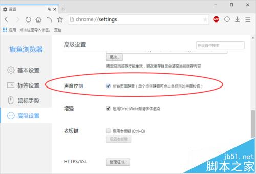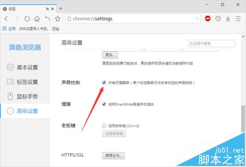 6、在“高级设置”选项卡的右侧窗格,找到“声音控制”下的“所有页面静音”选项并将其勾选即可。如图所示;