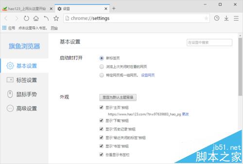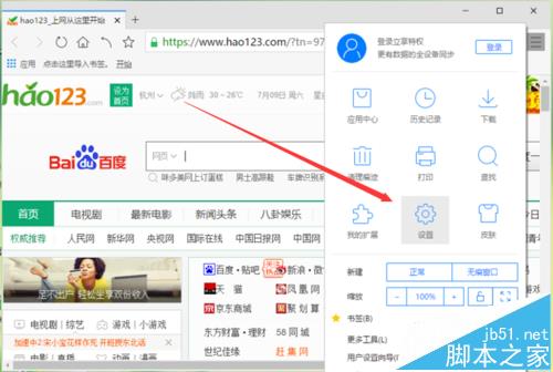 4、点击“设置”命令选项后,这个时候会弹出浏览器“设置”对话框。如图所示;