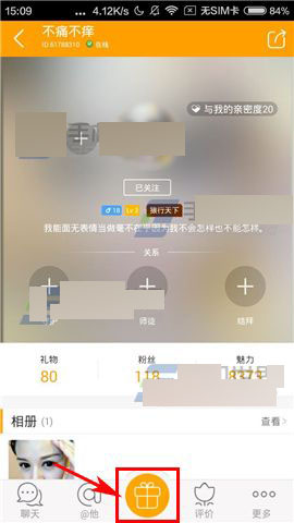 1)打开对面,点击打开要送礼物的好友,接着点击下方中间的【按钮】;(如下图)