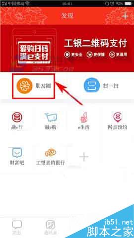 1)打开工银融e联,点击下方的【发现】,然后点击【朋友圈】;(如下图)