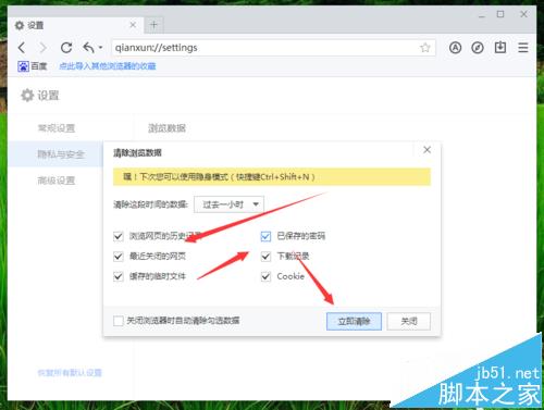 8、在“清除浏览数据”对话窗口中,选择要清除的数据选项,并点击“立即清除”按钮即可。如图所示;