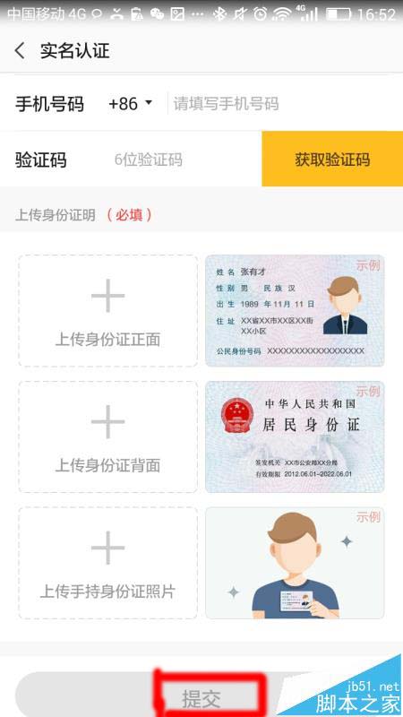 4、填写需要的信息,并上传自己的身份证照片,和自己手持身份证的照片,完成以后点击提交就好了。