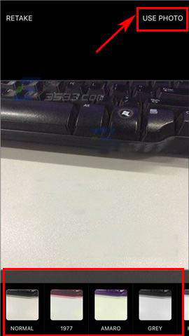 2)然后点击屏幕下方中央的【拍照】按钮,设置好照片的尺寸及滤镜后点击右上角处的【USE PHOTO】;(如下图)