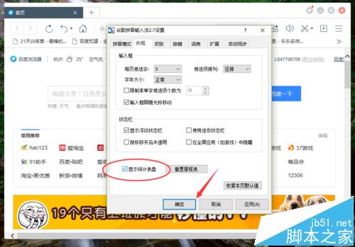 6、在外观选项卡中,找到“显示统计表盘”并将此选项勾选,,再点击“确定”按钮。如图所示;