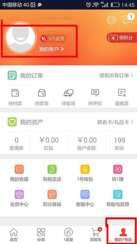 1、下载1号店app,打开进入以后,在右下角找到“我的1号店”,如下图所示。