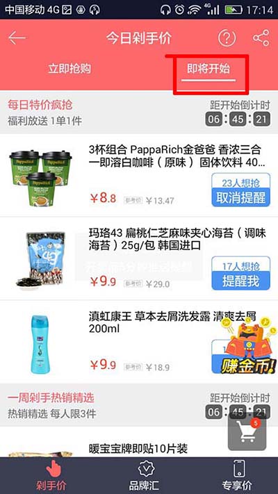 2、点击“今日剁手价”后面的三角,进入所有参与活动的商品,可以看到”立刻抢购“和”即将抢购“两个选项,点击”即将抢购“,将如下图所示。