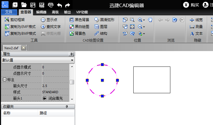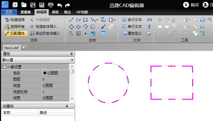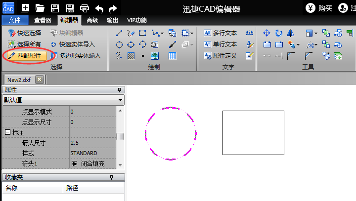2、如图所示,在CAD编辑器当前打开的图纸中,若要将圆形对象的线宽、线型、颜色等属性应用到右侧的矩形对象上,需要先选择圆形对象。