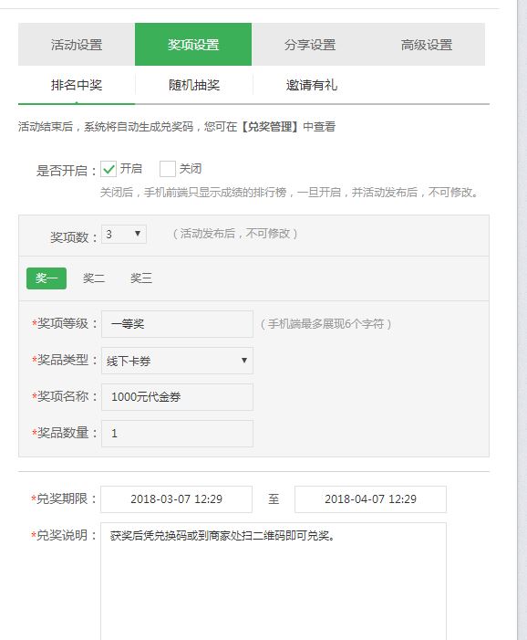 第四步:游戏的奖项设置,一共有三个,排名中奖,就是在活动时间结束之后,系统会根据每个人玩的积分生成一个排行榜的,然后商家可以根据排行榜进行发奖的,然后编辑奖项和兑奖时间和规则即可,最后的高级设置里可以自定义企业LOGO,设置关注选项,保存并发布游戏