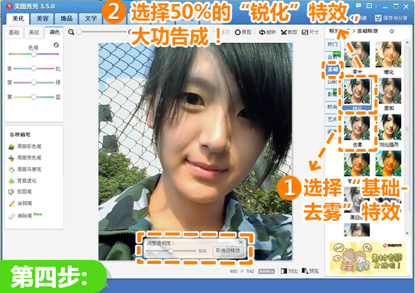 4、最后选择“基础-去雾”特效,再选择50%的“锐化”特效,提高色彩对比和清晰度,就大功告成啦!